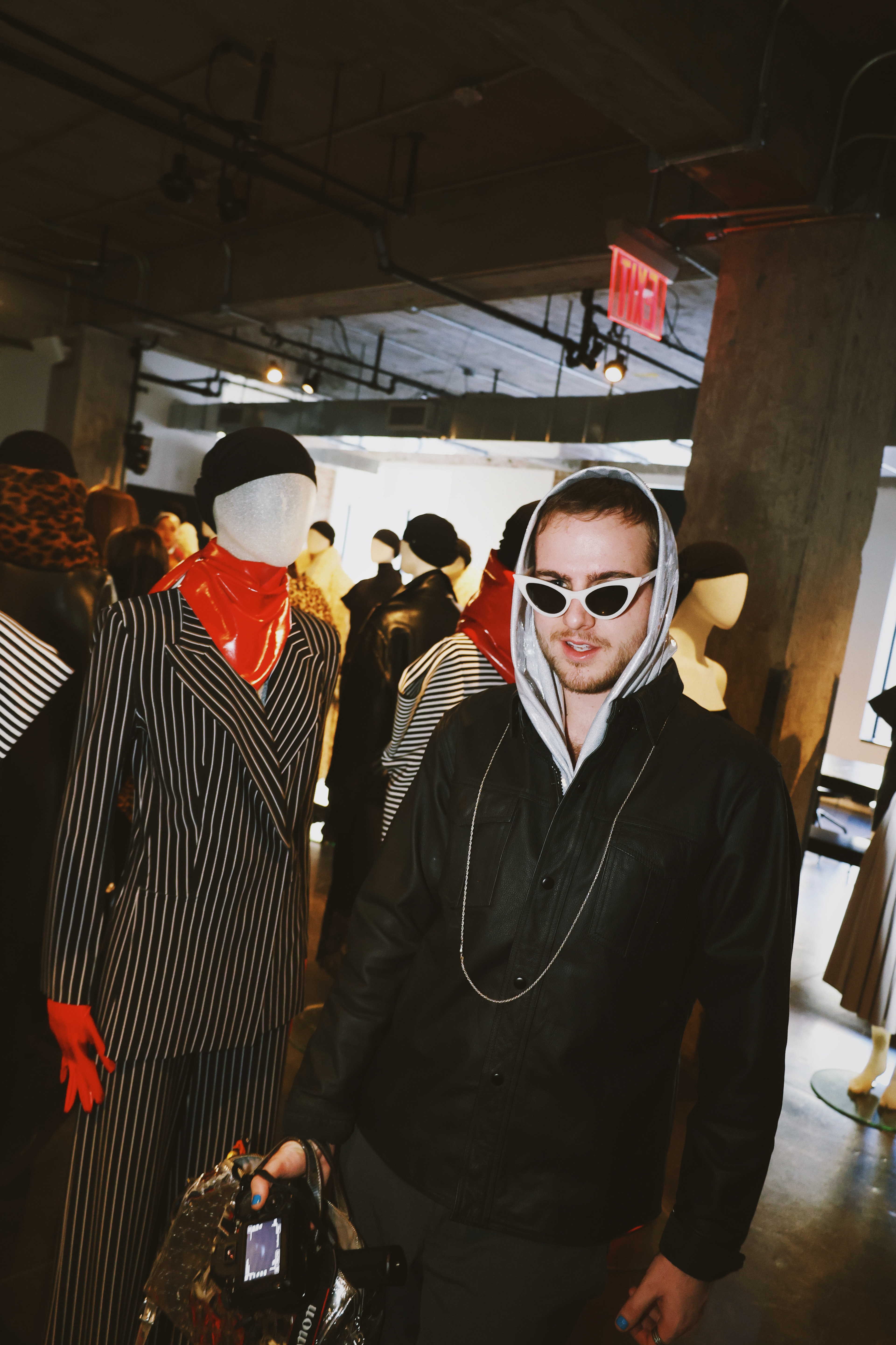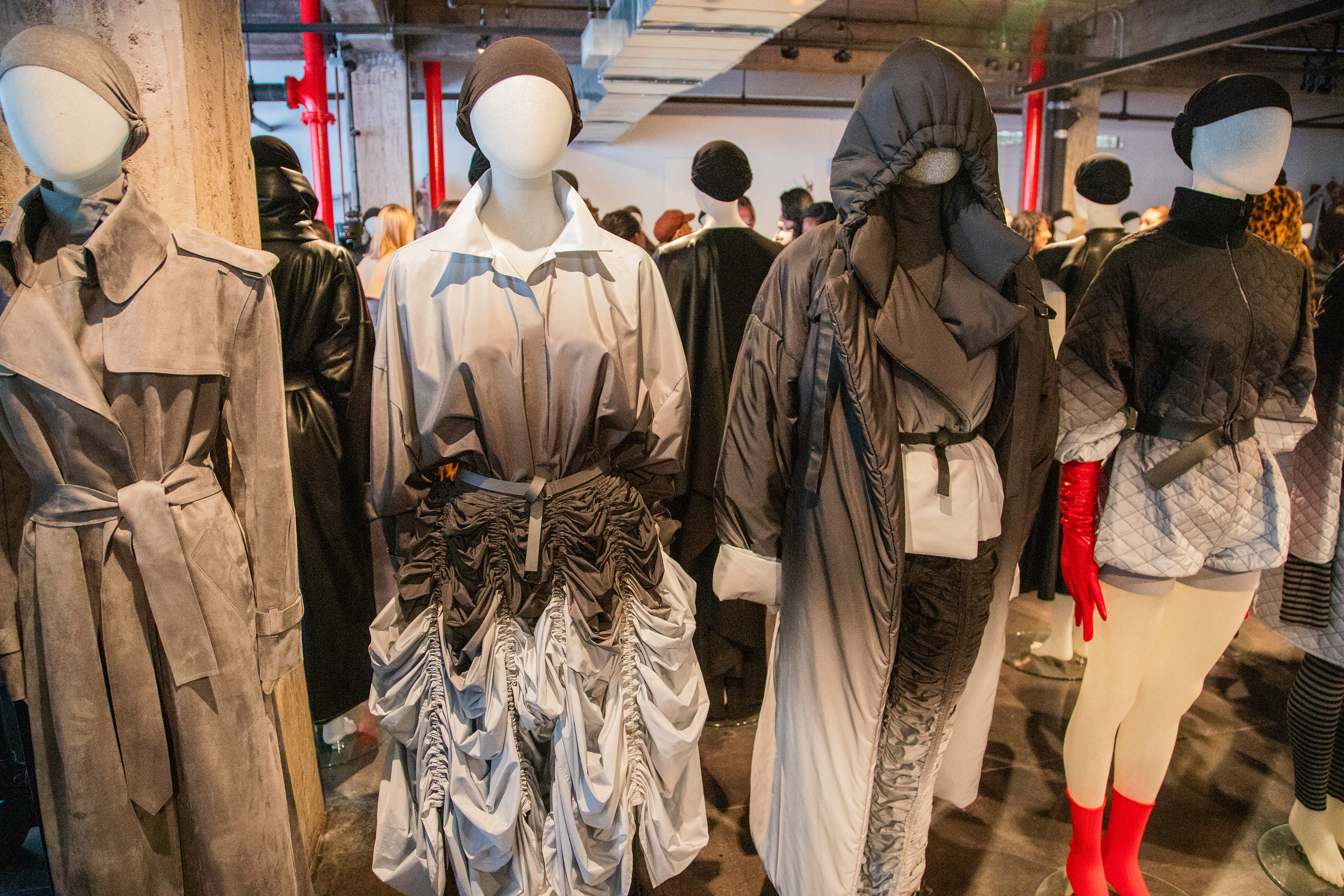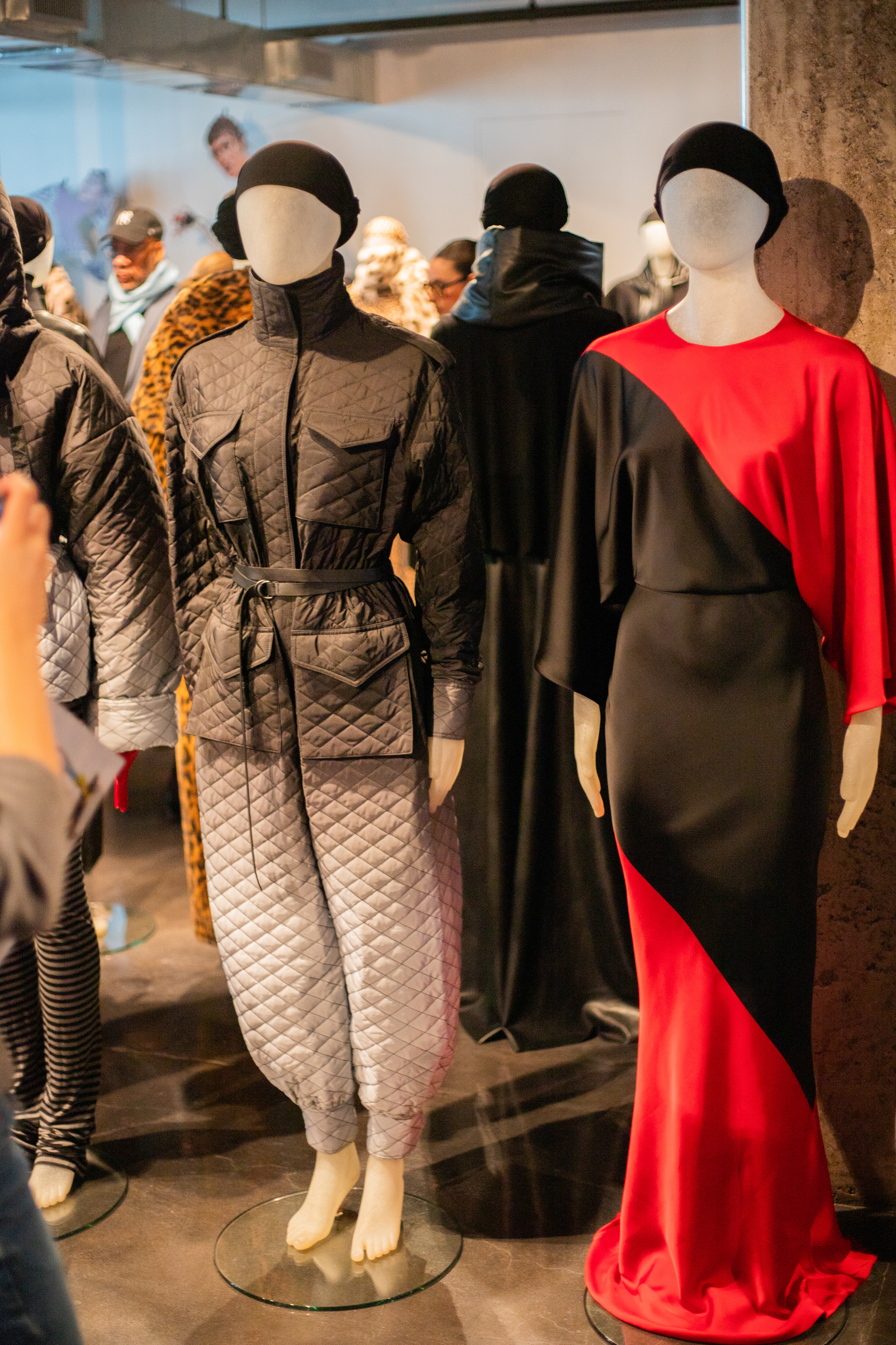 The reflective material showcased in about a quarter of the collection brought guests to a standstill. Many were surprised to see the innovation and used their cellphones to see the fabric hit light. In true NK fashion, the hooded top was in place as well as the scarfs that adorn many of her showstoppers. Pictured to the left you can see vloggers excited to capture the shine.