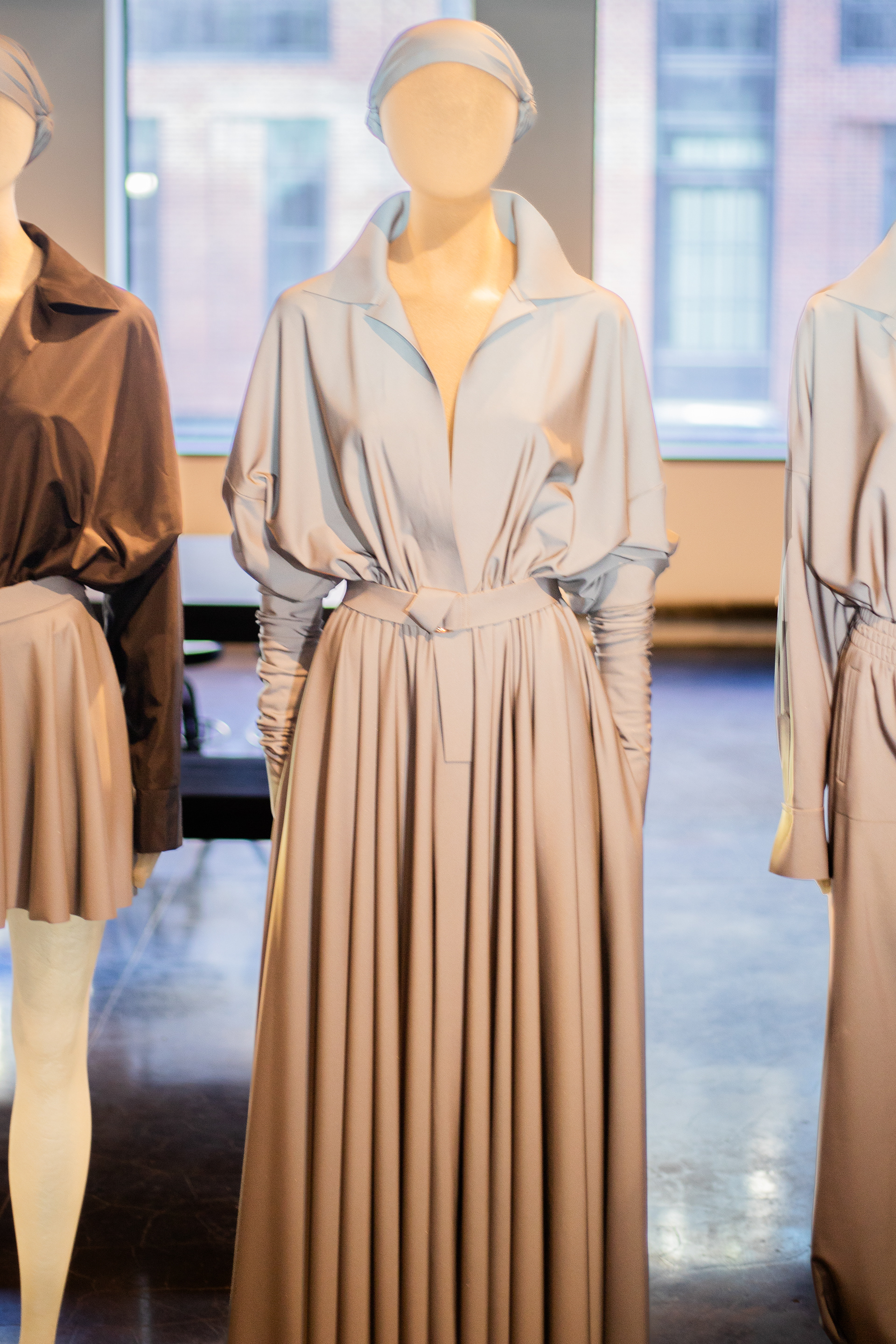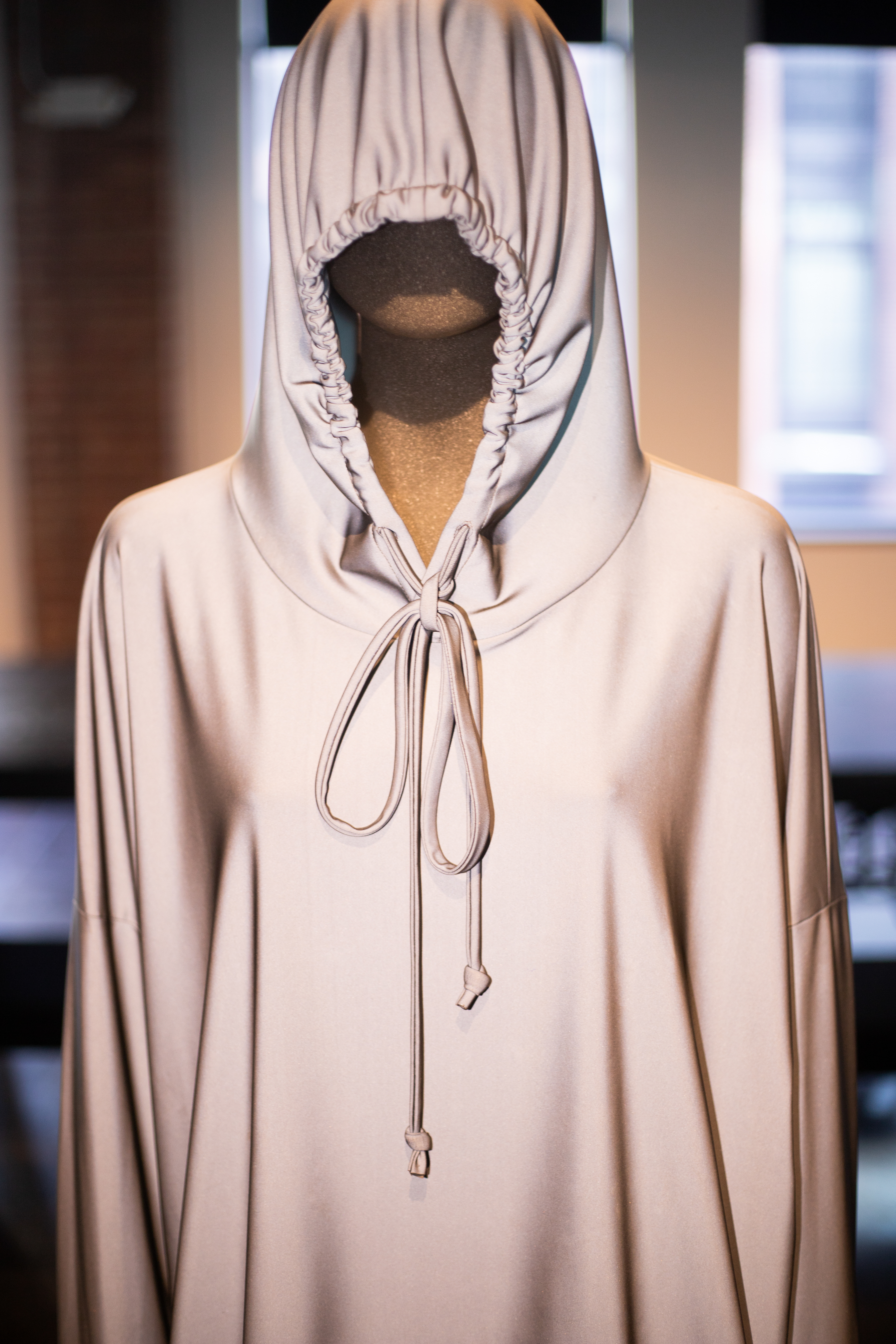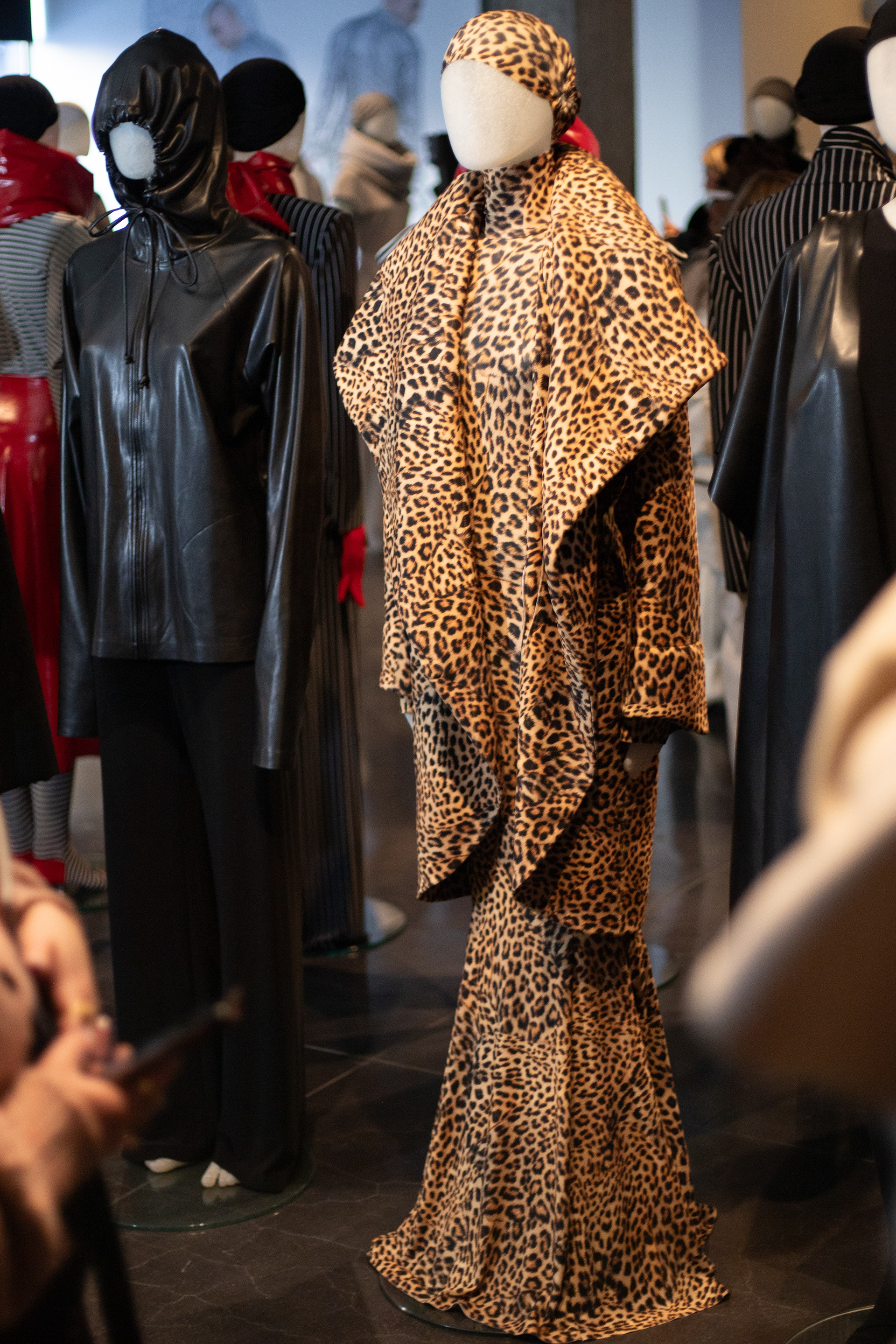 The reflective material showcased in about a quarter of the collection brought guests to a standstill. Many were surprised to see the innovation and used their cellphones to see the fabric hit light. In true NK fashion, the hooded top was in place as well as the scarfs that adorn many of her showstoppers. Pictured to the left you can see vloggers excited to capture the shine.