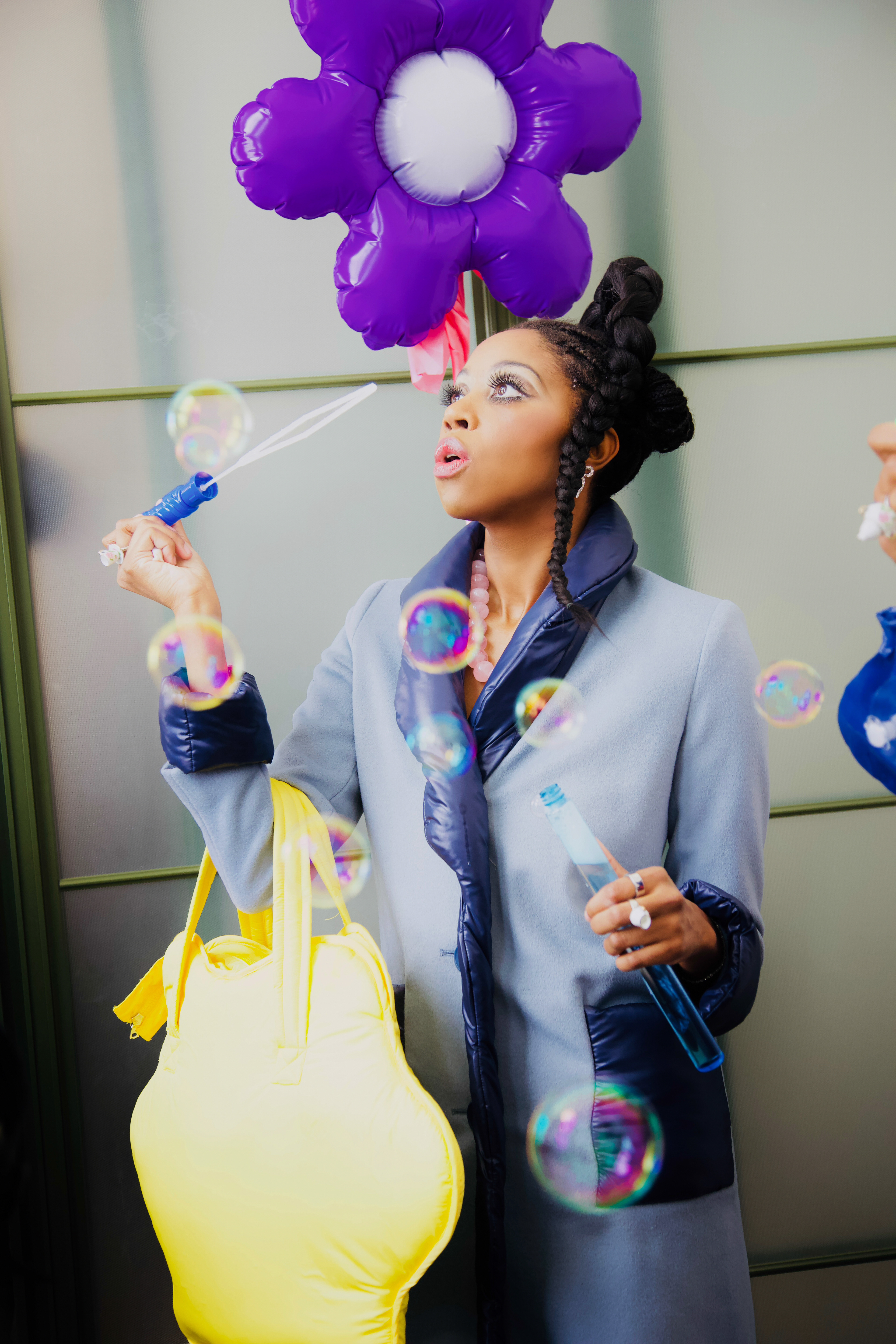 Floating above the city - Tabbe Designs presented a fabulous collection. From the heights of Midtown you could see bubbles and colors! The models were all given glamour makeup and what I would call even more elaborate clothing.